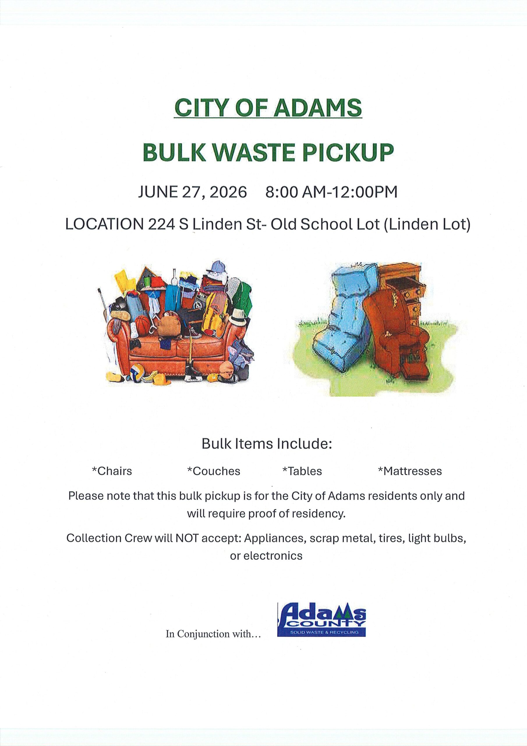 BULK WASTE PICKUP Posted on April 1, 2026 at 12:28 pm.Written by Web Administrator CITY OF ADAMS RESIDENTS BULK PICKUP JUNE 27, 2026
